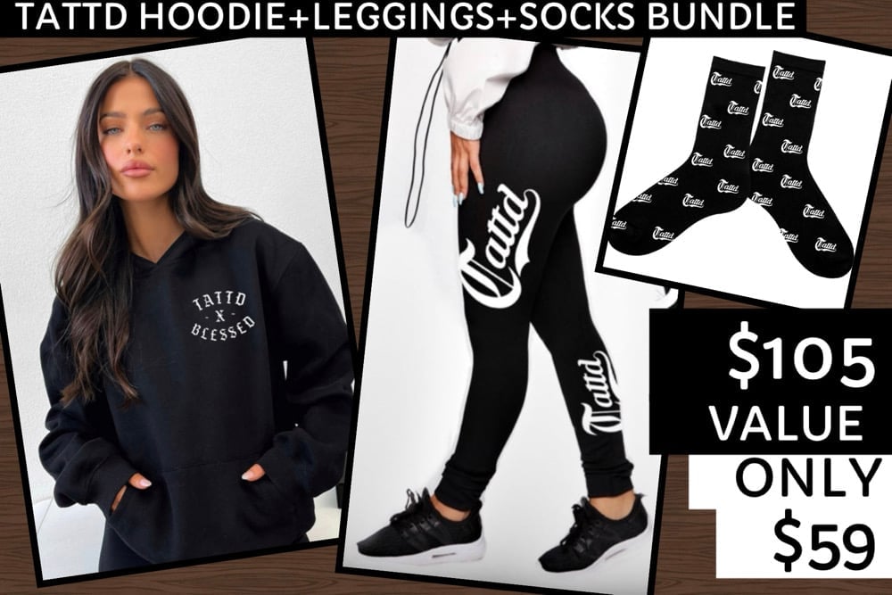 This bundle includes ANY 1 Tattd pullover hoodie that’s on the website + one pair of black Tattd leggings + one pair of Tattd socks. If you’d like a certain color hoodie, just comment the color and style in the NOTES or INSTRUCTION section at checkout. If no specifiedhoodie is in the notes then you will receive the black and white Tattd&blessed hoodie. 😊